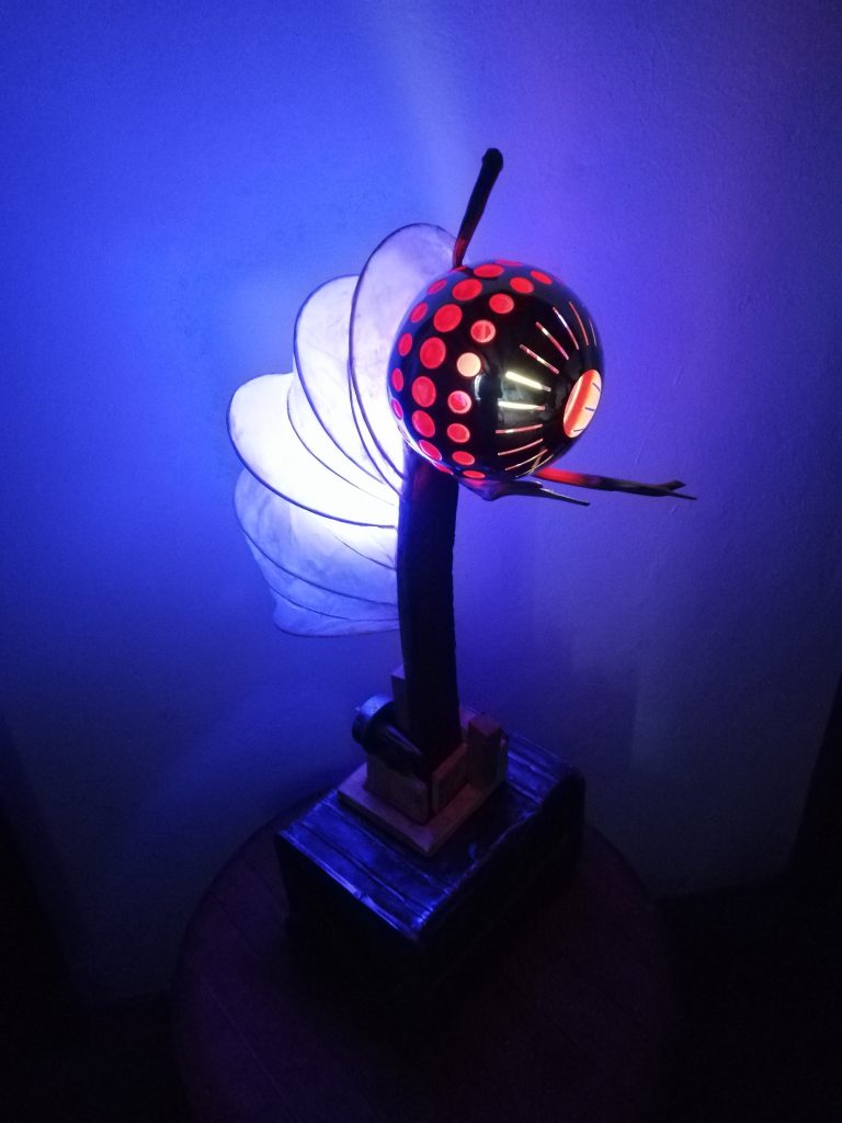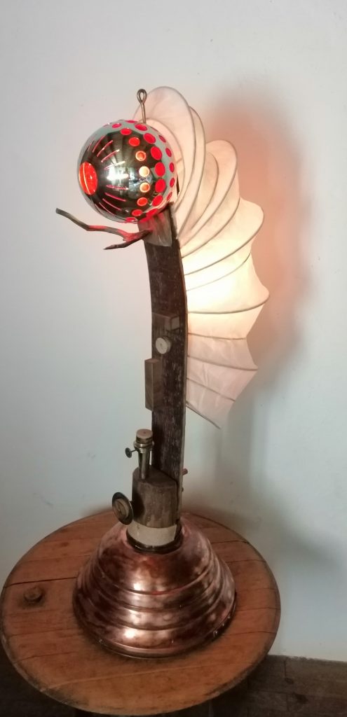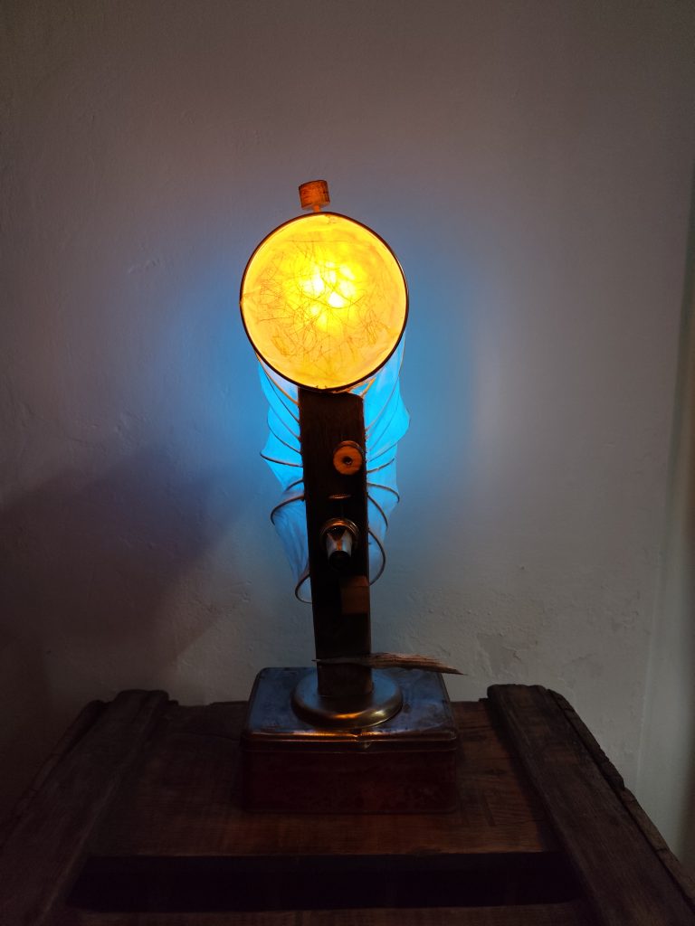 Chaque lampe bicolore est une œuvre unique, née de la rencontre entre un objet du quotidien et l’imagination. Je chine des objets insolites, des pièces désuètes.Vous pouvez me confiez vous même un objet que je transforme en tête de lampe. En y intégrant une ampoule, je leur offre une nouvelle vie, une nouvelle fonction. Fixée sur une douelle, un morceau de bois, la tête est mise en valeur par un cocon lumineux, abritant une deuxième ampoule. Ce duo crée une ambiance singulière, où la lumière se joue des formes et des matières. »