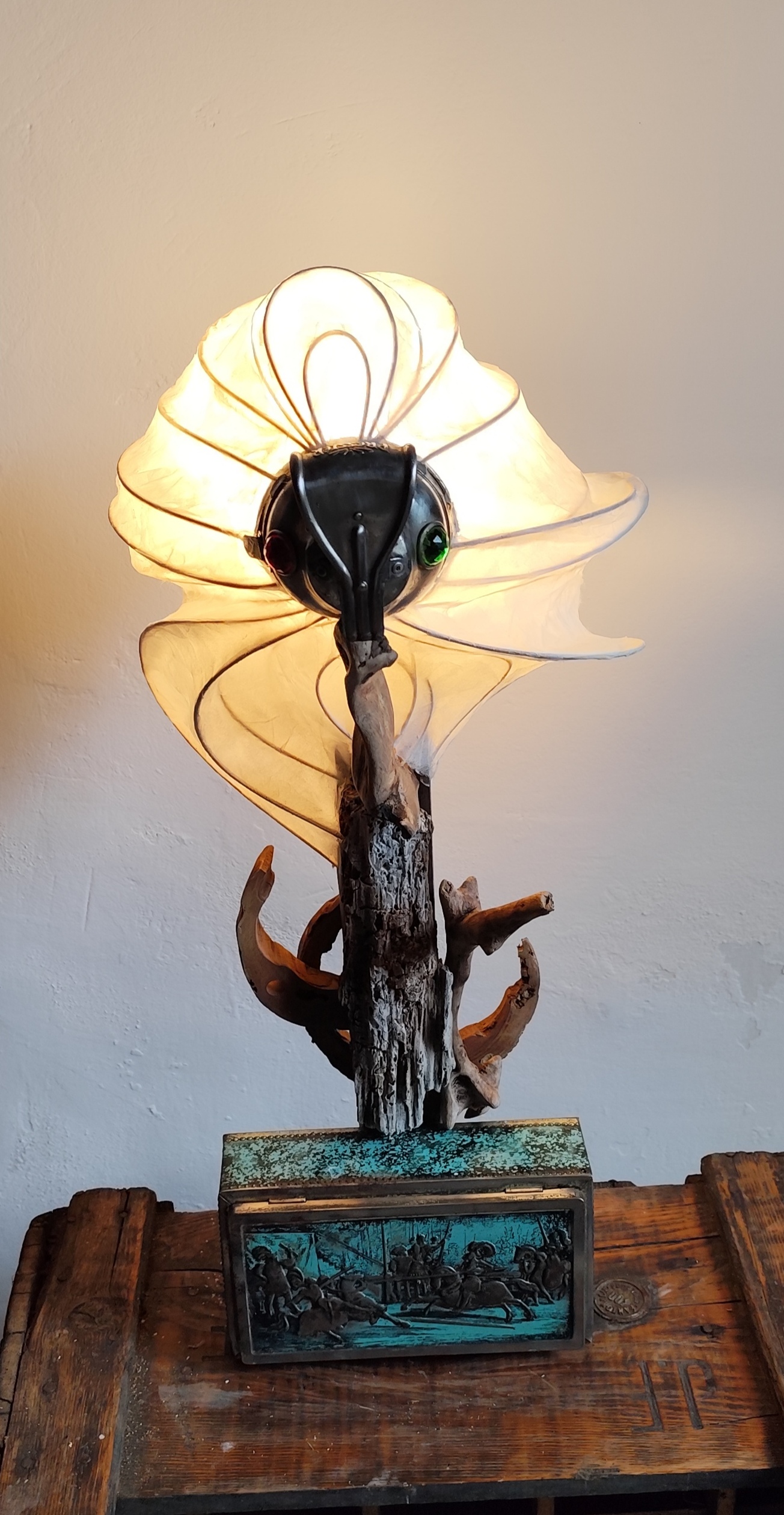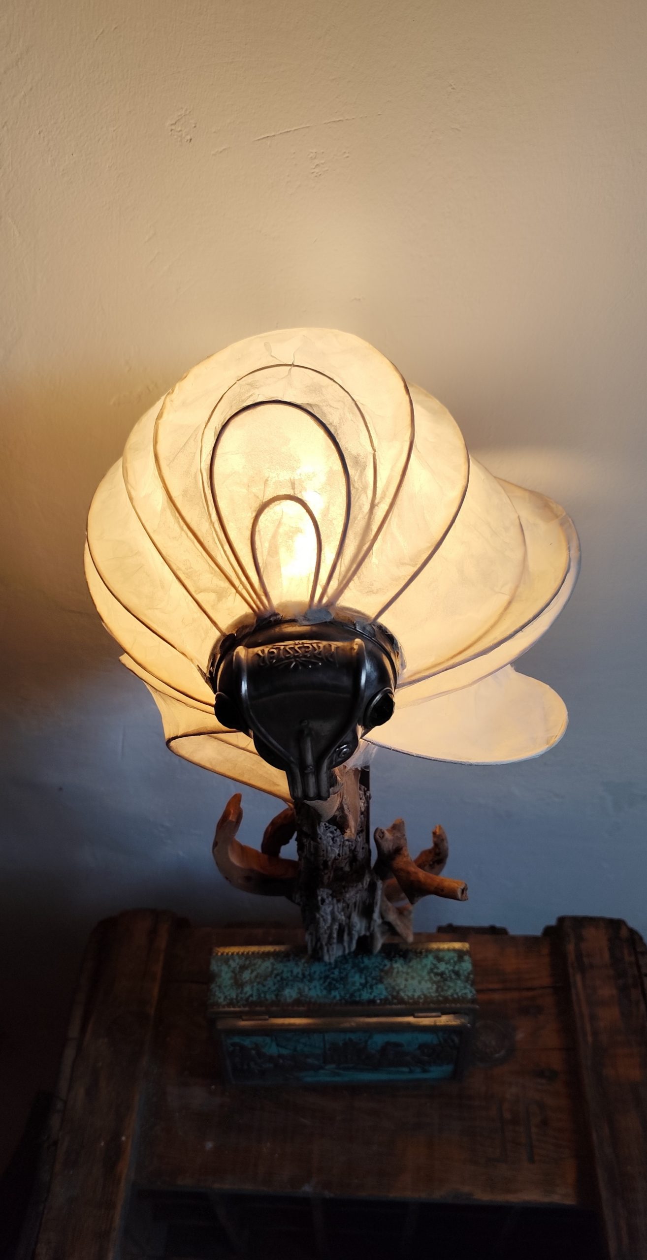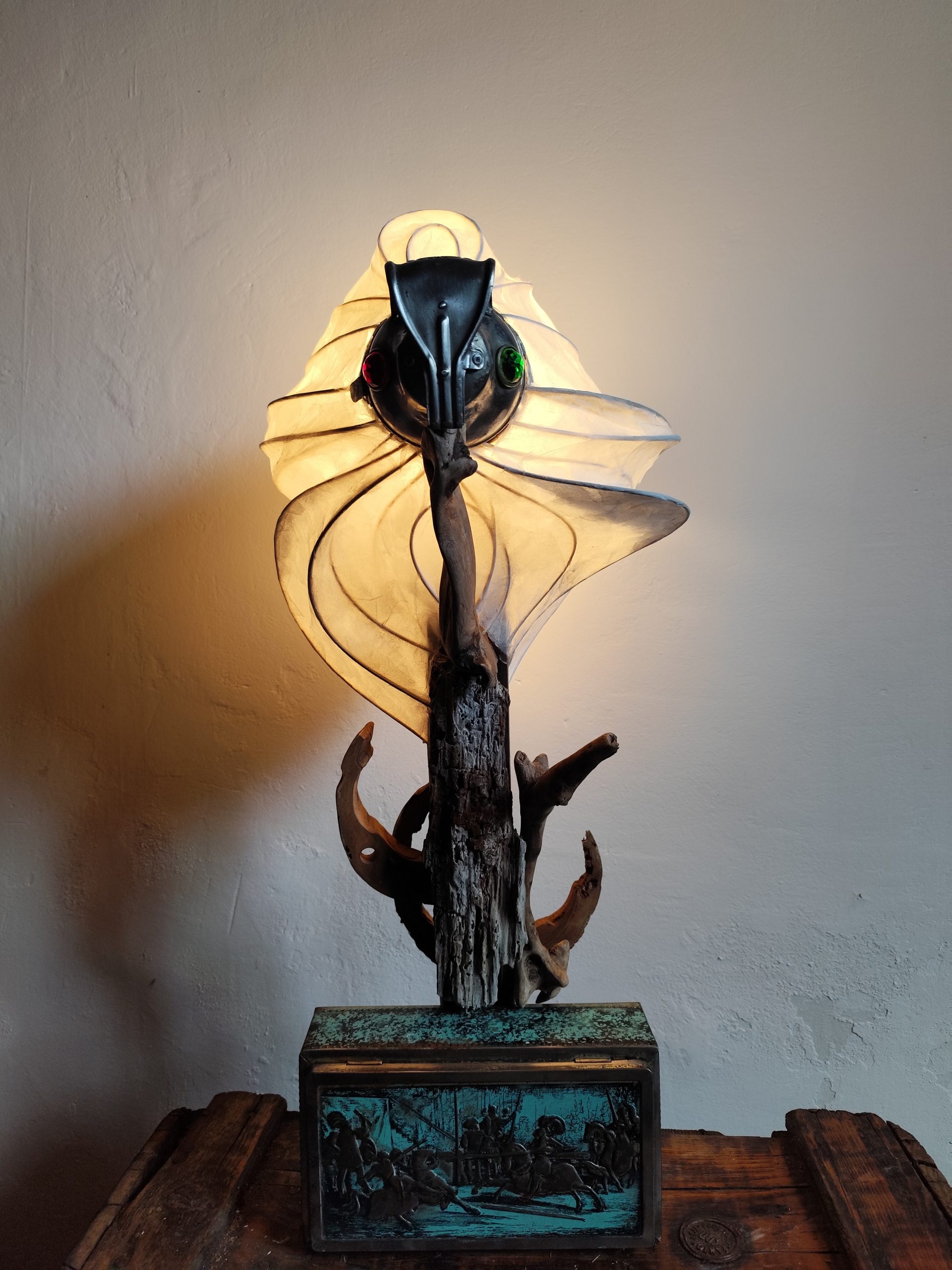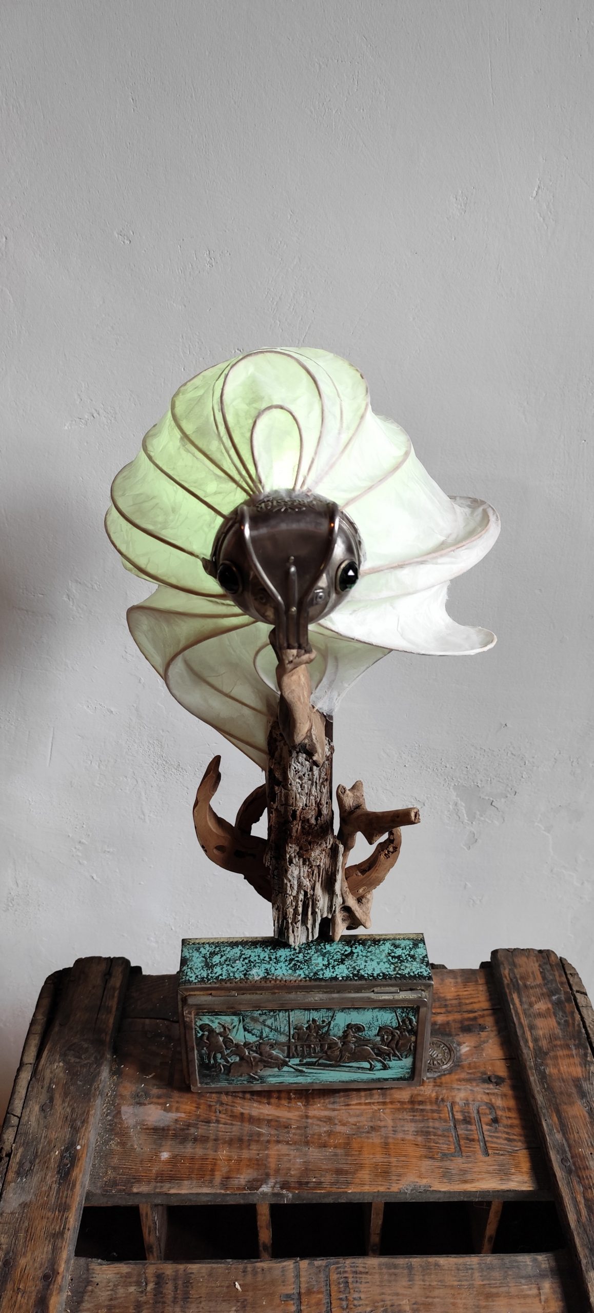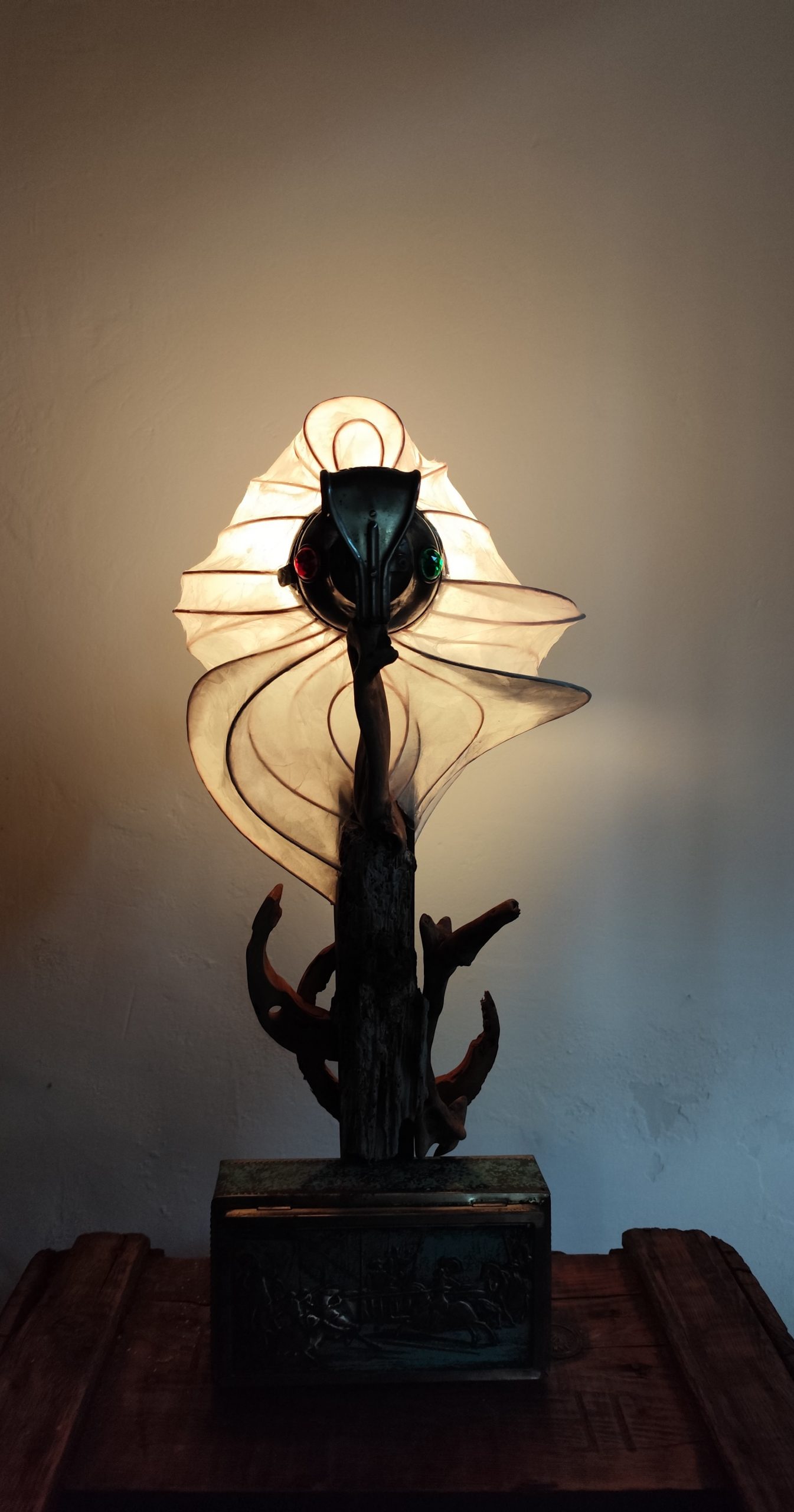jeu de lumière, grâce à la tête (dessus de lampe à pétrole) qui possède 2 œilletons de couleur