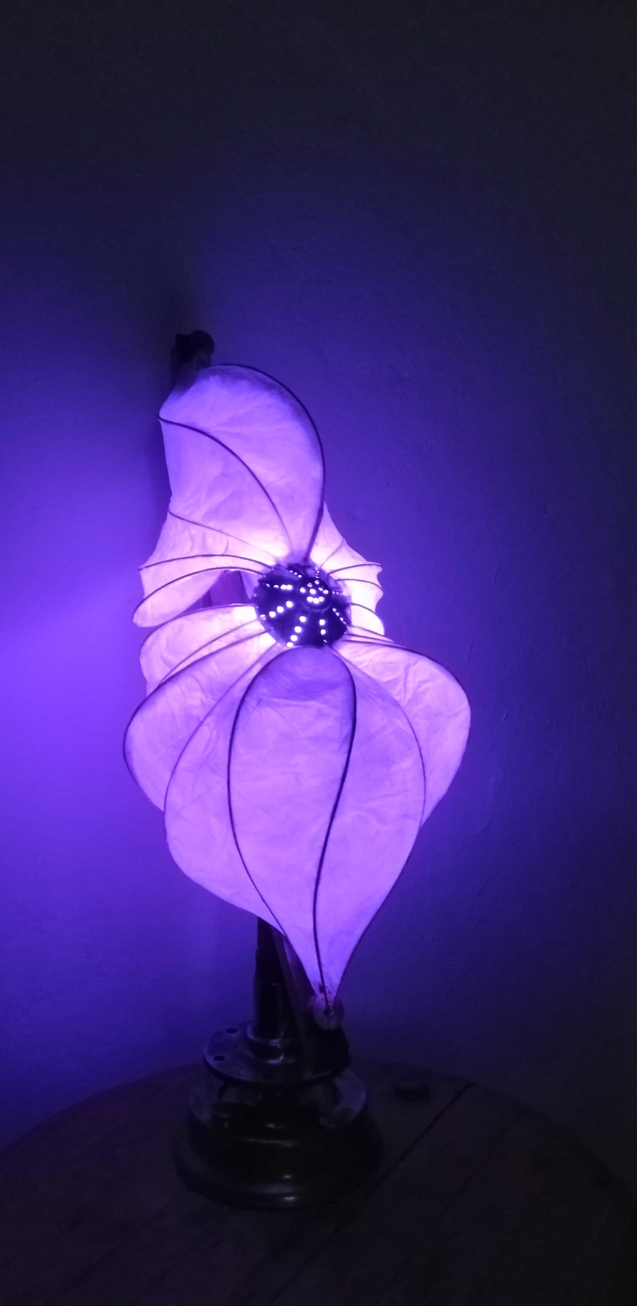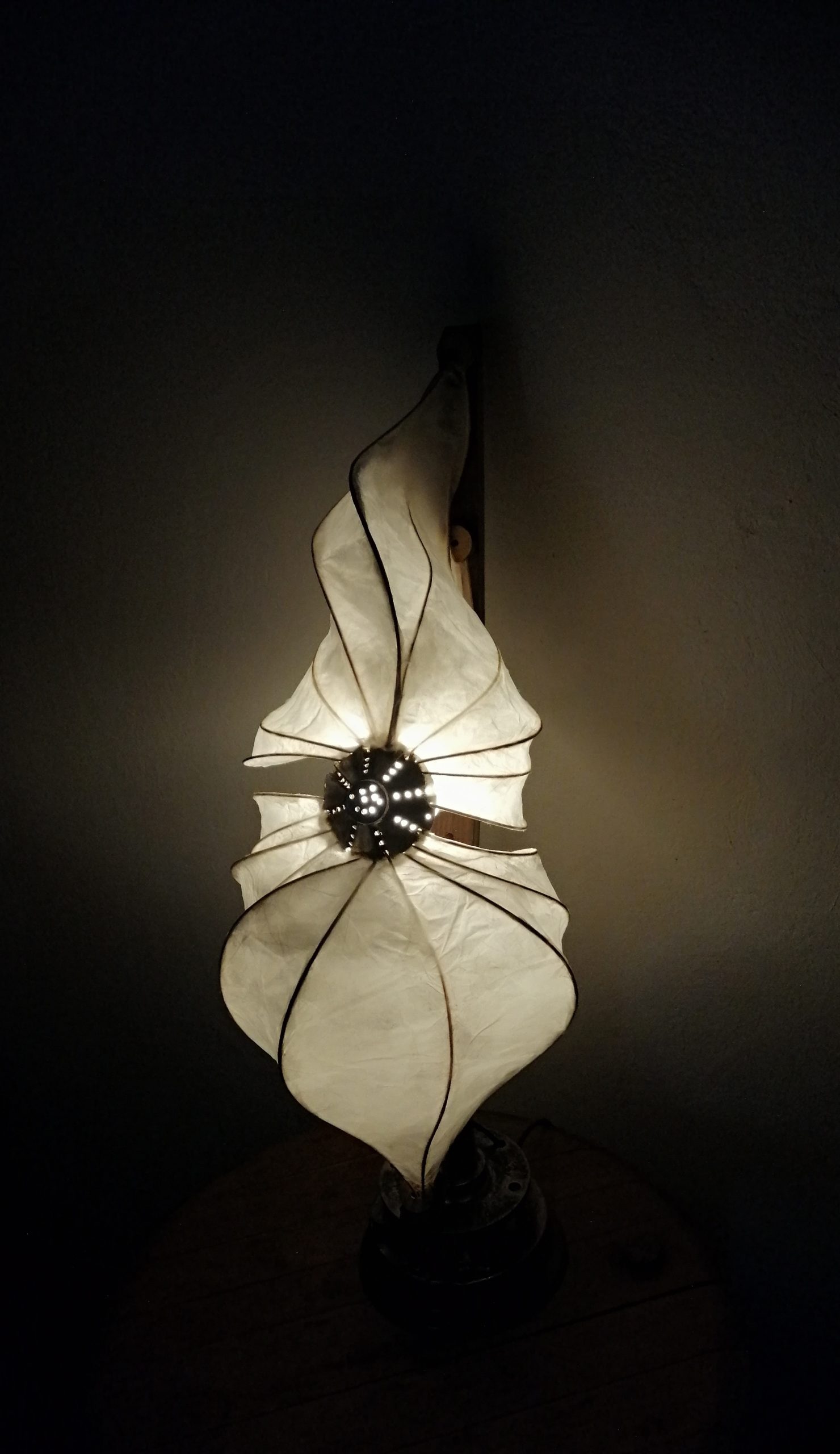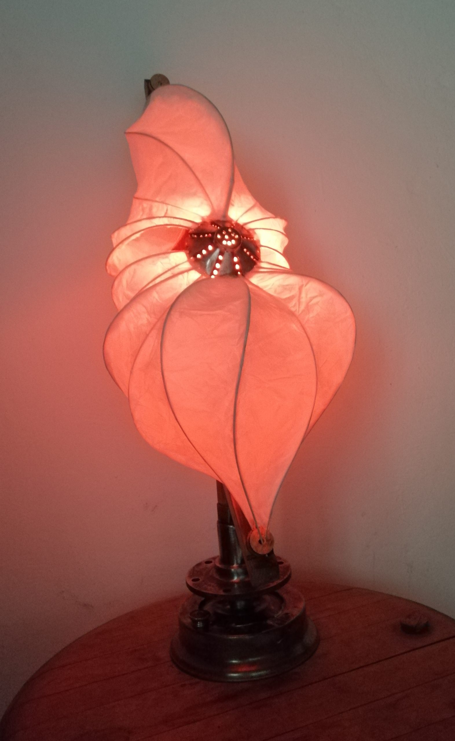 Le trépied de la lampe est un assemblage original et robuste. Il est composé d’une douelle de tonneau en bois, qui sert de base solide, et de pièces métalliques provenant d’une vieille lampe à pétrole et d’un 4X4. Ces éléments contrastent avec la finesse du papier japonais, créant un effet visuel intéressant.