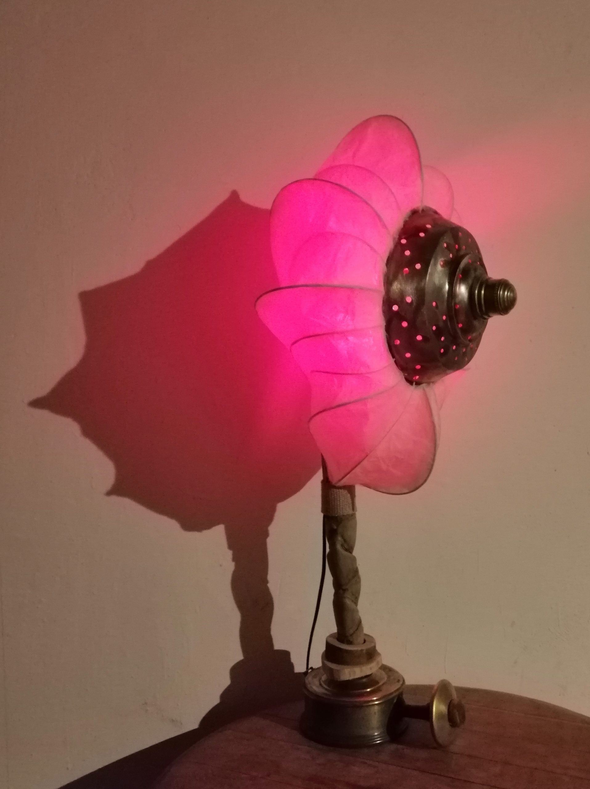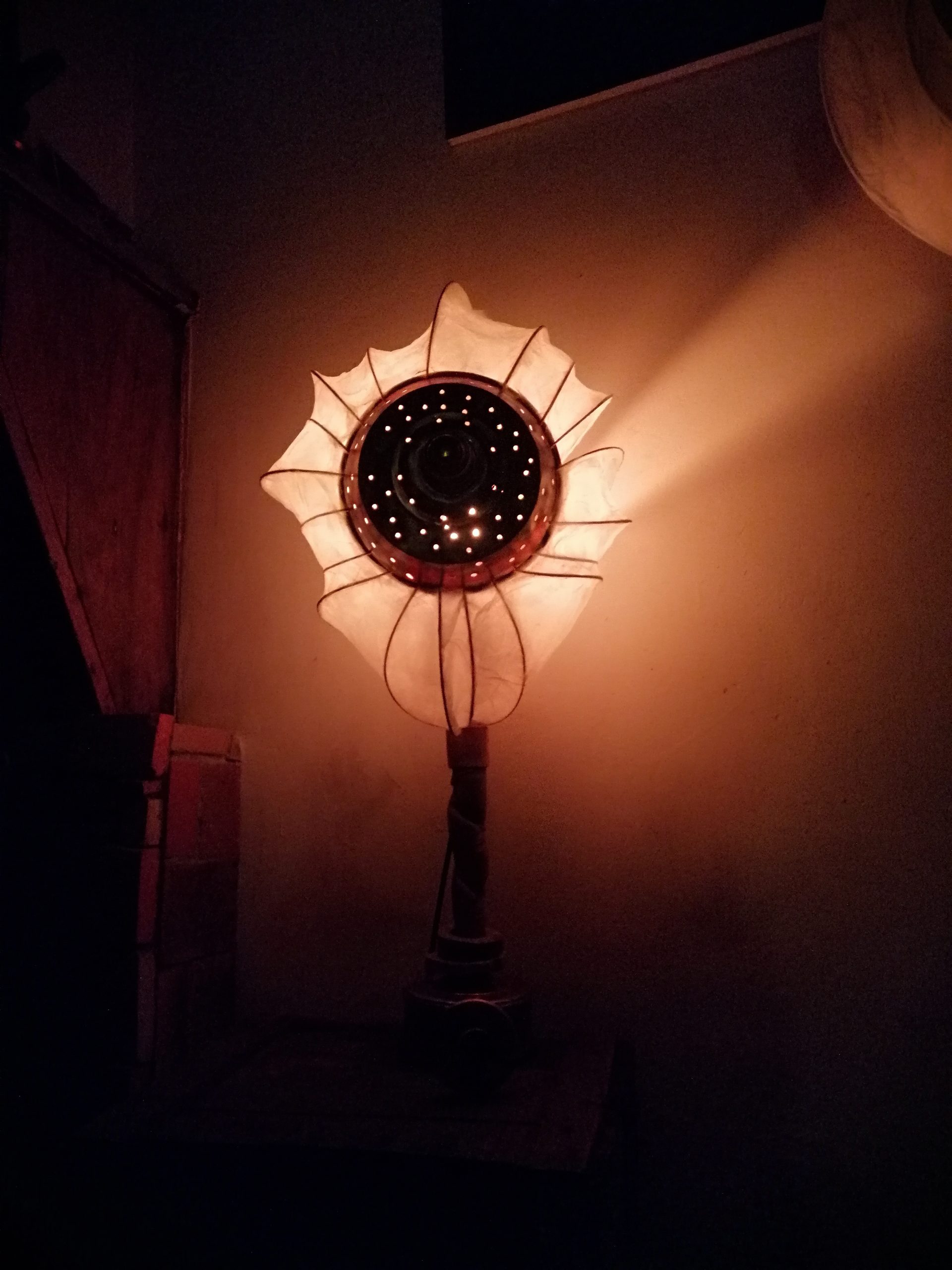 disque de cuivre perforé, bambou, pied de lampe à pétrole, genévrier