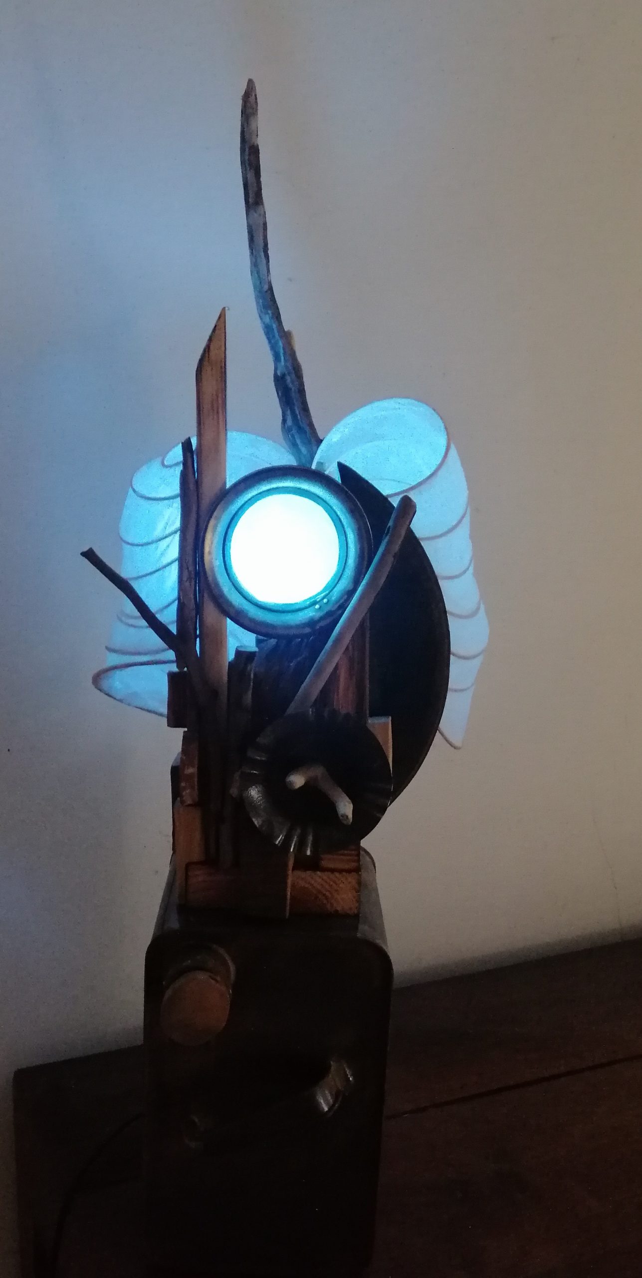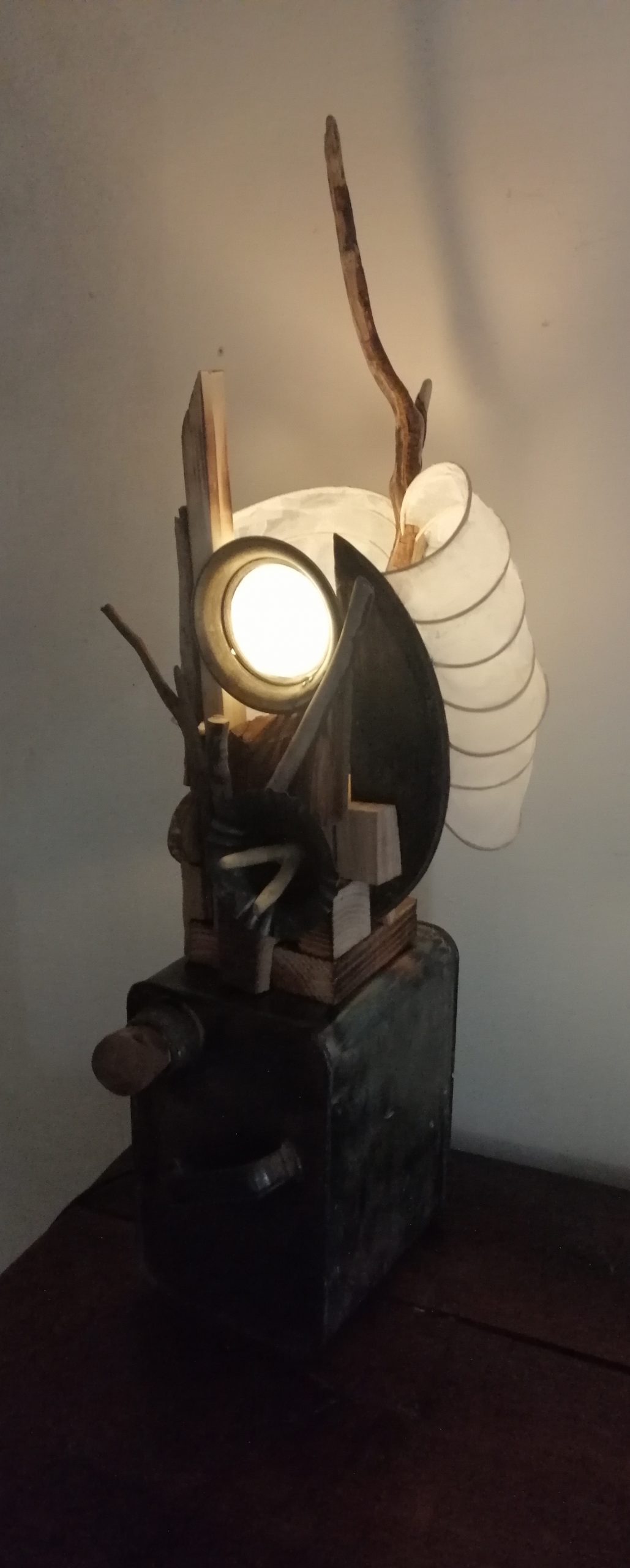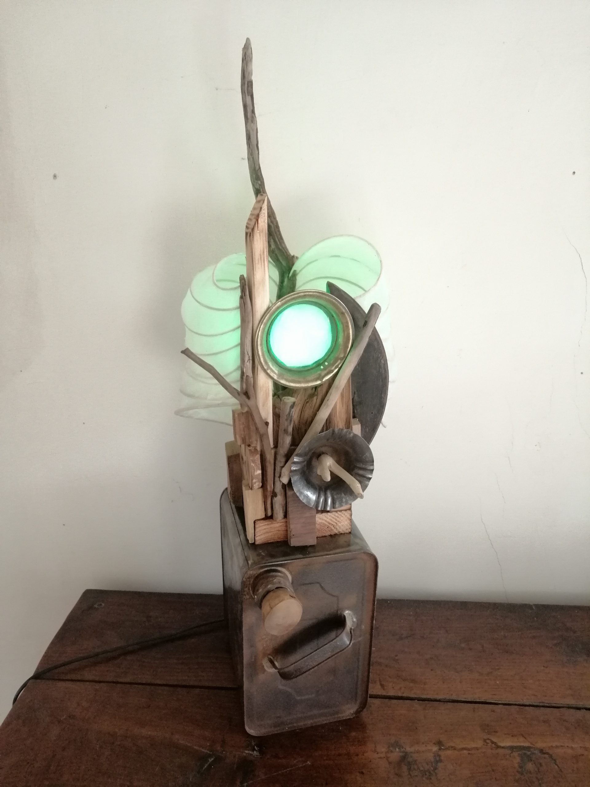 Le bidon de ferraille, transformé en base solide, apporte une touche d’originalité et d’industrialisme à la création.
