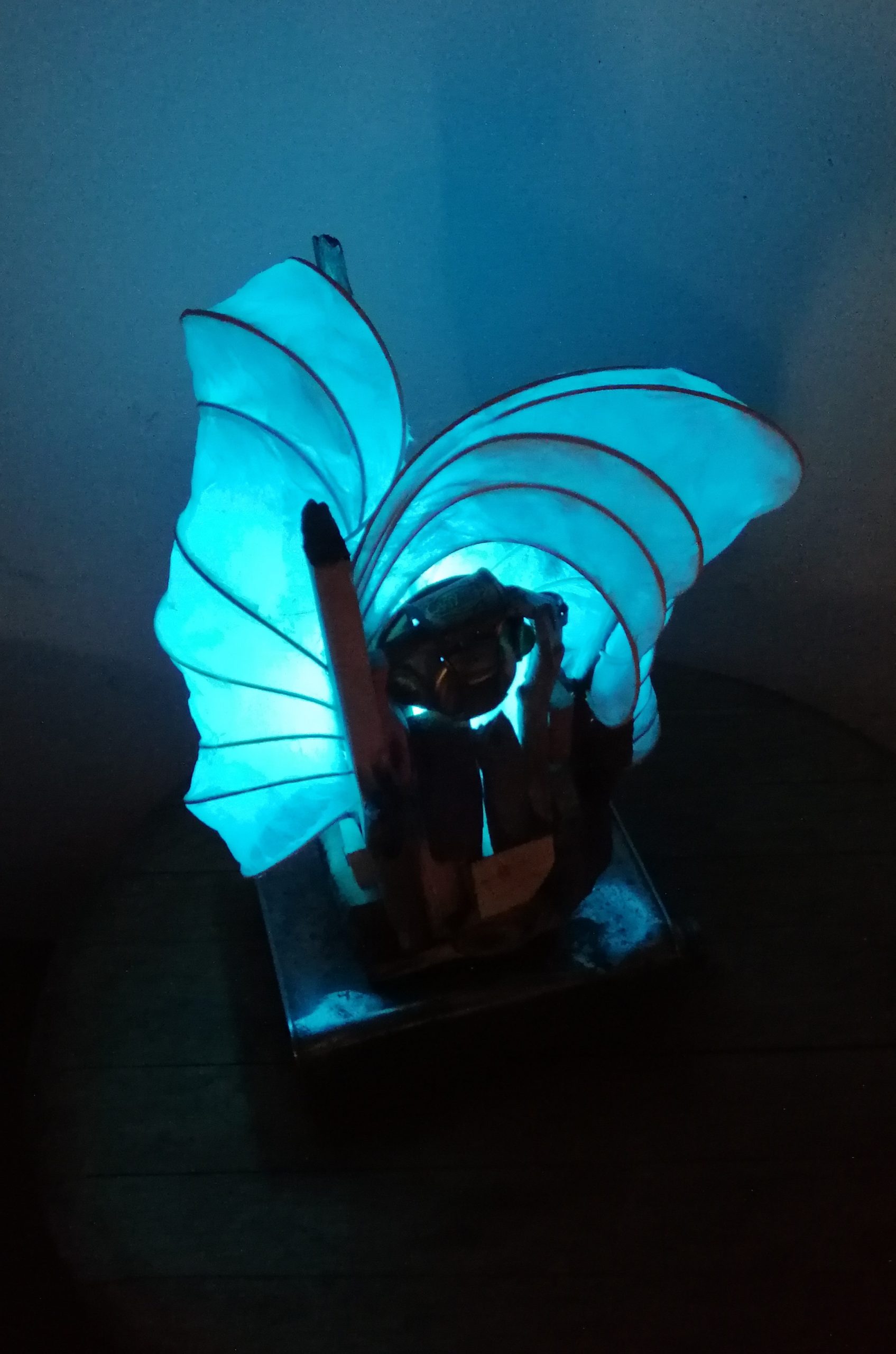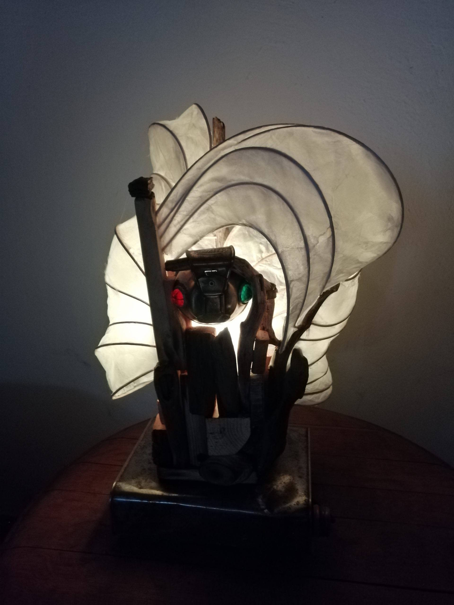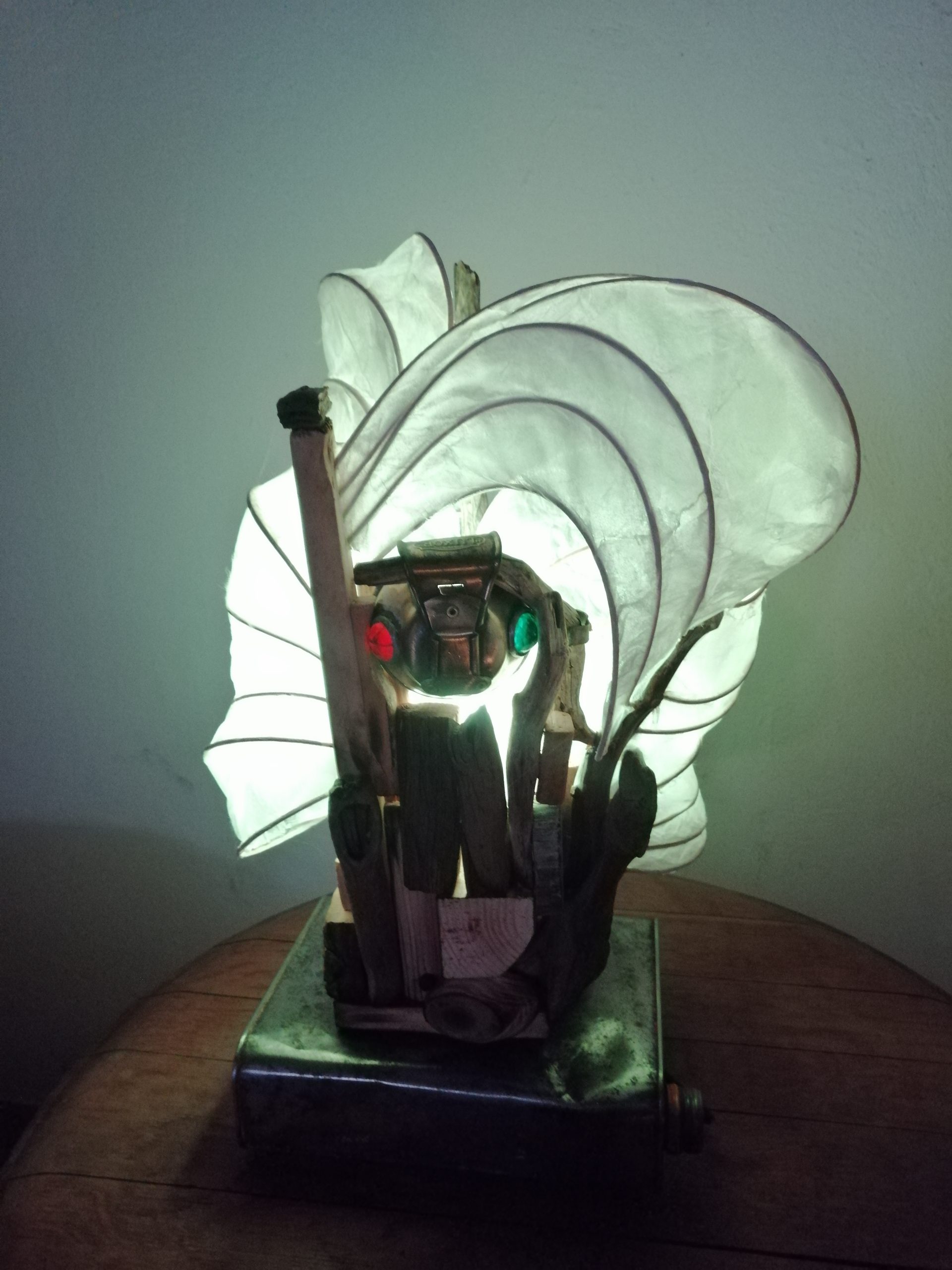 Des yeux bicolores, perçants et intenses, fixent le regard, ajoutant une touche de profondeur et d’ mystère à la lampe.
