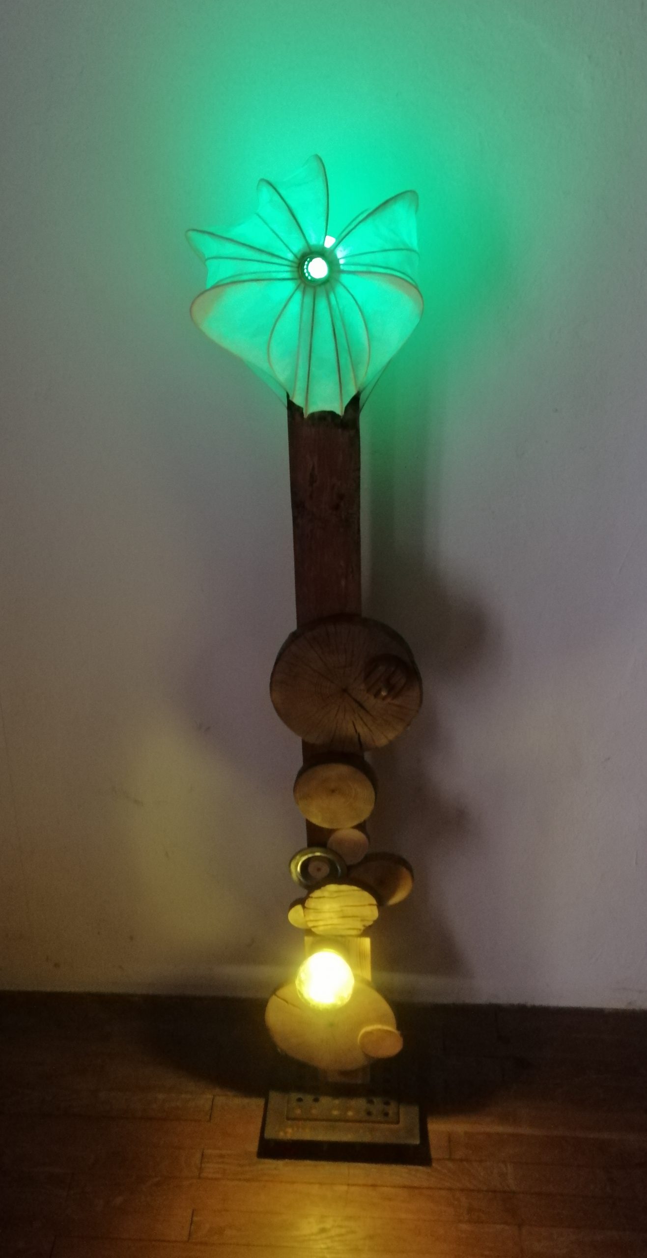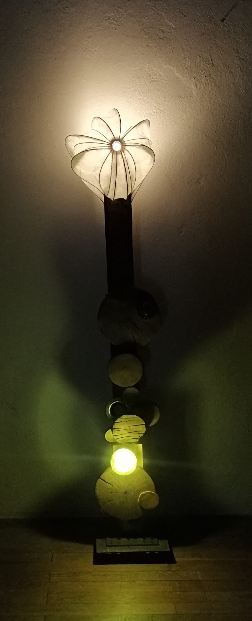 Le support de la lampe est fabriqué à partir d’une latte de cuve à vin, recyclée et poncée pour obtenir une surface lisse et élégante. Cette pièce robuste assure la stabilité de la lampe et apporte une touche rustique à l’ensemble.