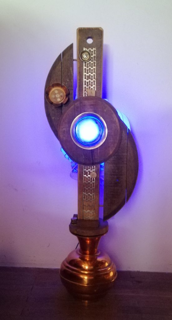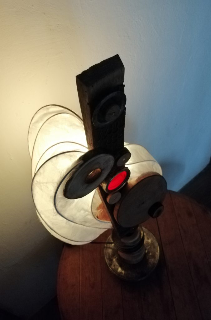 Lampe à poser ,faite avec un tuyau de poêle pour le pied ,une douelle de tonneau pour la structure ou plusieurs éléments s’harmonisent (œilleton de vieille lanterne, bois brulé…)Le contraste entre le bois brut, le métal lisse et le papier fin est saisissant et donne à la lampe une dimension artistique